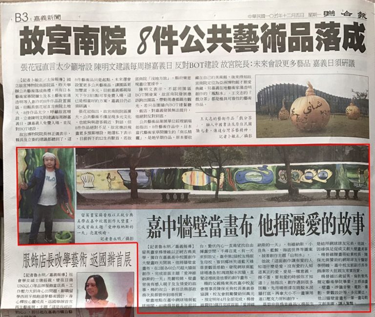 楊的父親楊東英找嘉中校友會理事長陳保光與校長黃義春協調,校友會鼓勵贊助50萬元,預定明年4月全部完成,楊晉維費時3個月完成首面「愛神維納斯的一天」,有維納斯、小丑魚、藍鯨、海底世界等圖案,接著創作主題「山和水」。